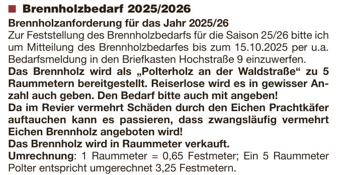 Wir treffen uns um 9 Uhr am Gemeindeschuppen. Ich freue mich auf viele Helfer und bitte euch, entsprechendes Werkzeug mitzubringen.