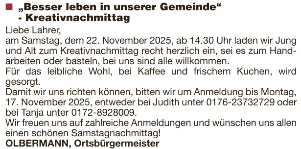 24. Oktober 2025, um 15:30 Uhr am neuen Gemeindehaus. Ich bitte besonders auch