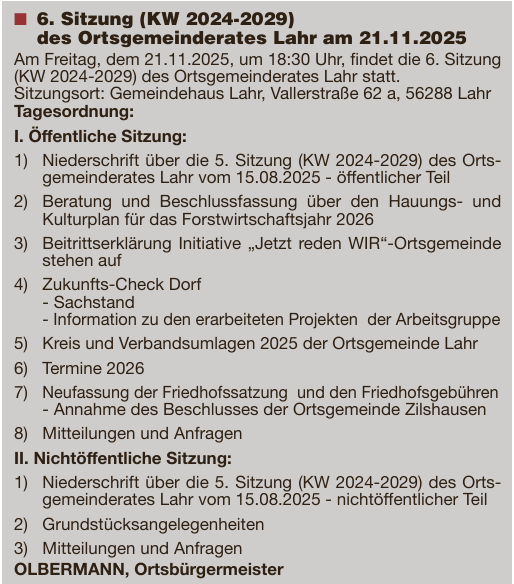 des RheinHunsrück Wasser Zweckverbandes in der Ortsgemeinde Lahr vom 10.11.2025