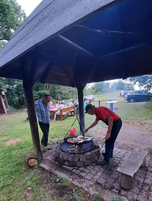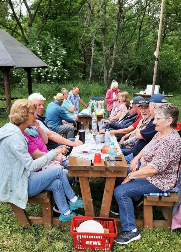 Um 10 Uhr traf man sich zum gemütlichen Beisammensein an der Blockhütte. Das Wetter spielte so gut mit, dass im Laufe des Tages mehrfach an schattige Plätze umgezogen werden musste .